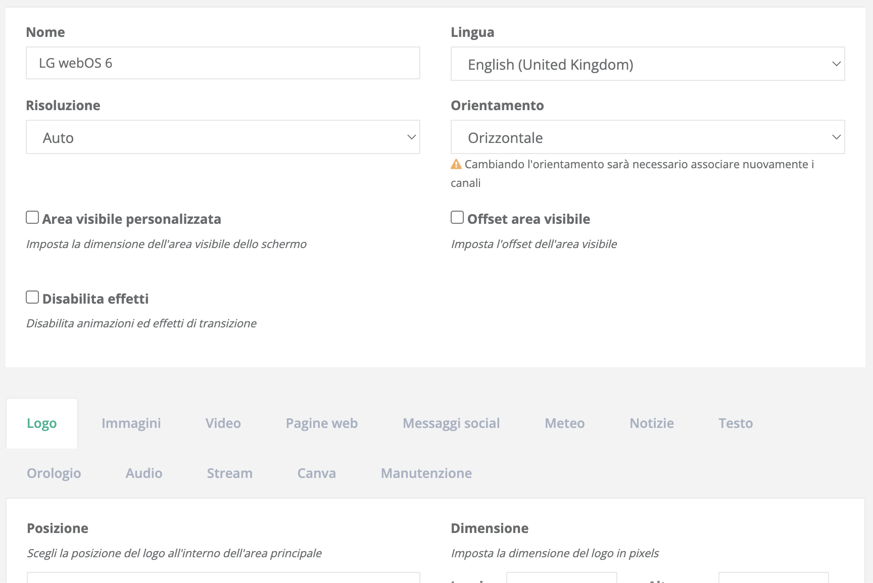 Consente di scegliere quale logo visualizzare e dove posizionarlo sullo schermo. L’immagine può essere selezionata tra quelle caricate nello storage cloud.