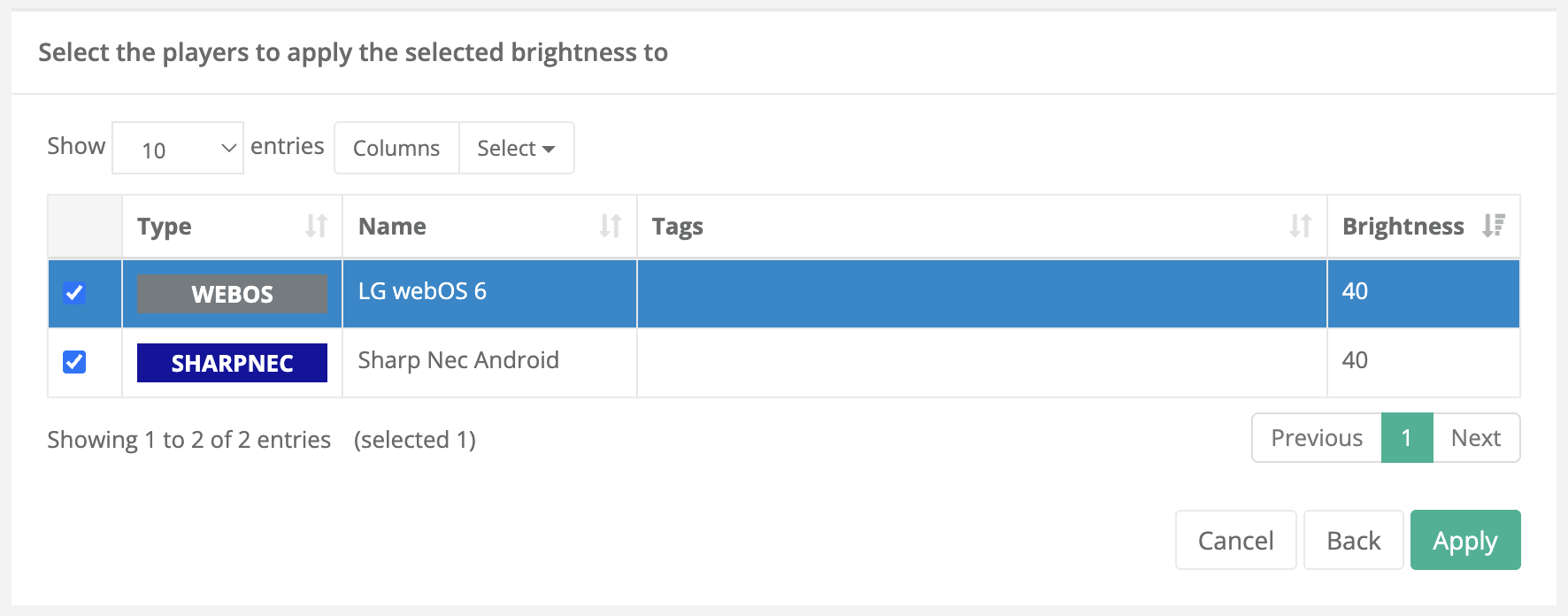 The table “Select the players to apply the selected brightness to” will be displayed.