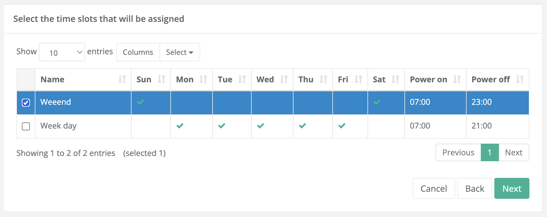 From the list “Select the time slots to assign” you can view the schedules already created (e.g., Weekday, Weekend) and, for each: