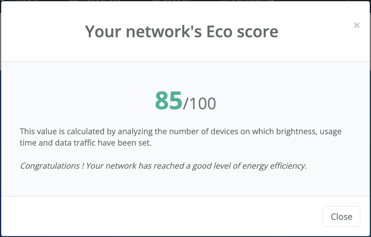 Discover your EcoScore → shows your score (e.g.: 85/100) and explains that the value is calculated based on how many devices have brightness, usage time, and (when available) data traffic reduction properly configured.