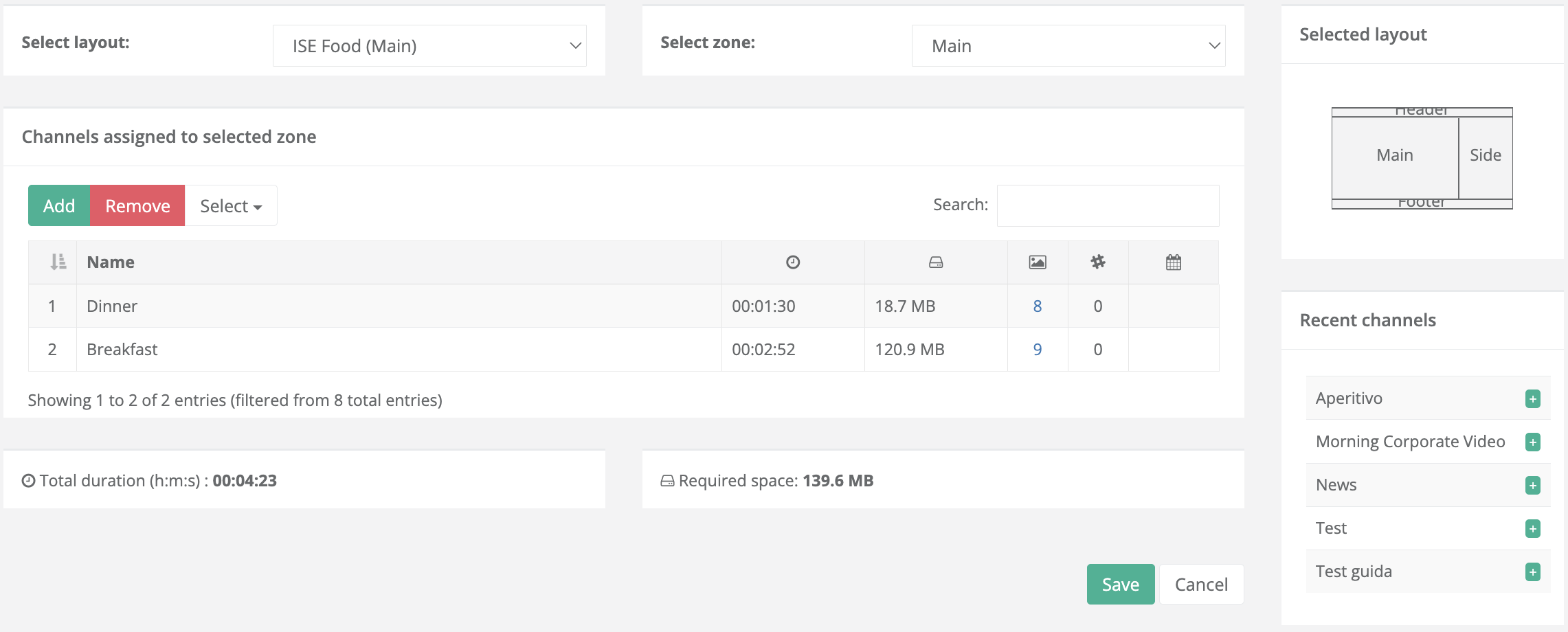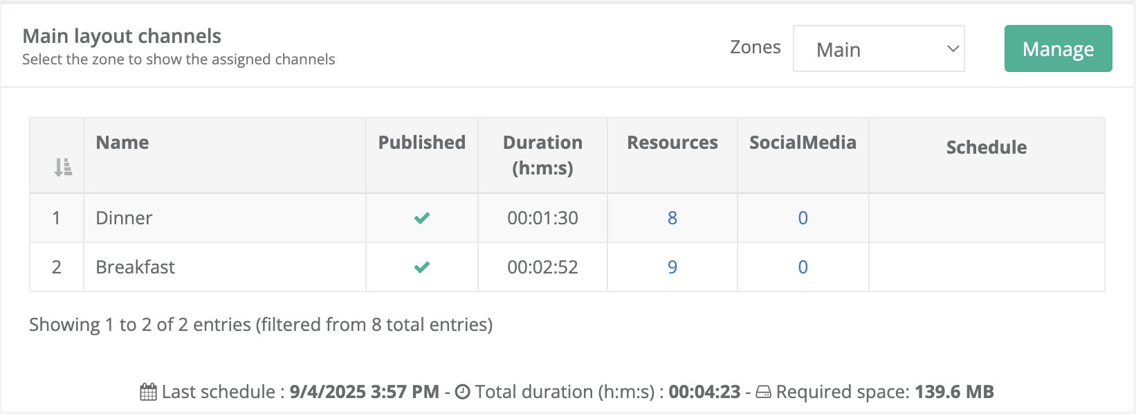Click Manage in the channel view section to access the screen dedicated to managing channels for each layout zone.