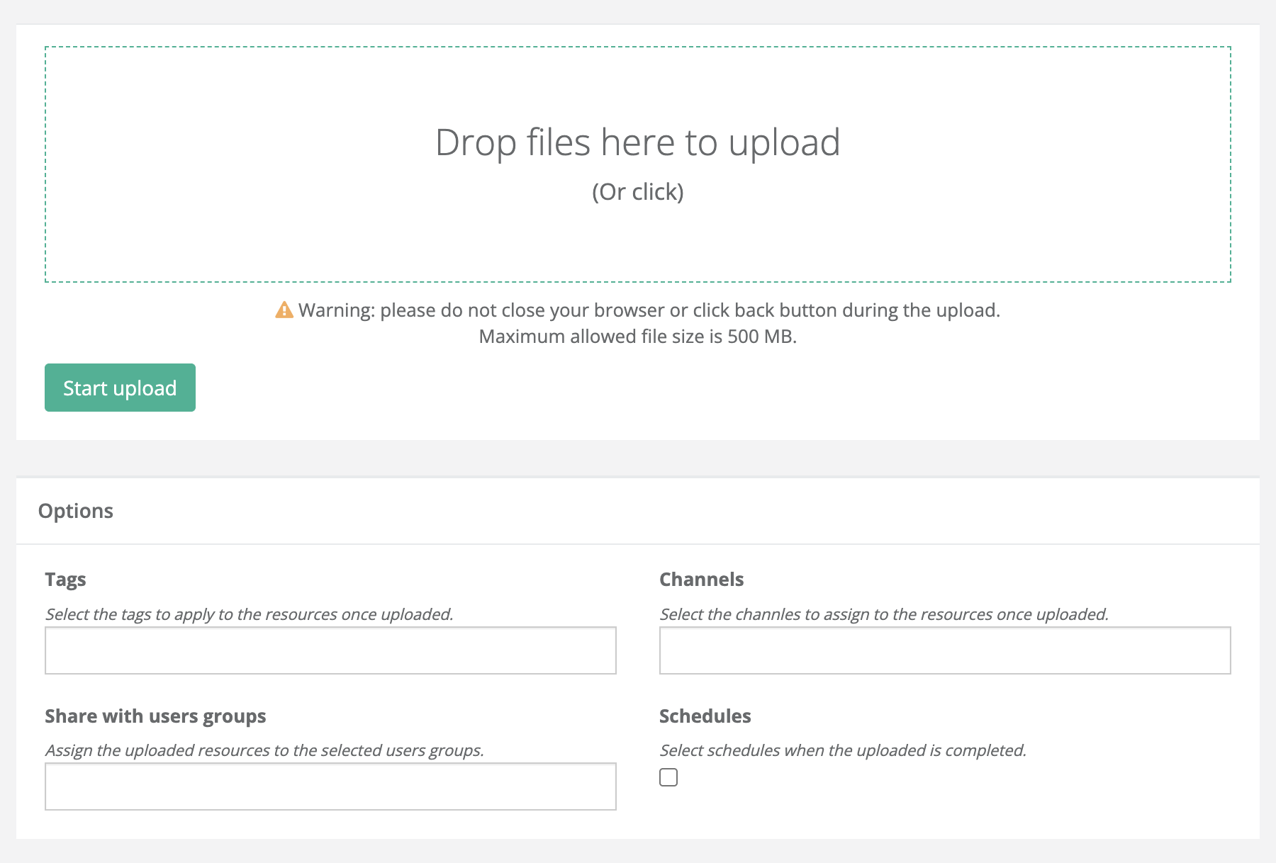 - For the uploaded files to be displayed on the screens, they must be assigned to one or more channels. If you don’t select any channel during the upload, remember to assign the uploaded files afterwards.
